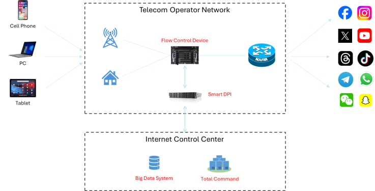 流量管控设备部署于运营商网络节点负责采集与执行,深度包检测引擎完成实时解析,管控中心统一调度并驱动可视化看板