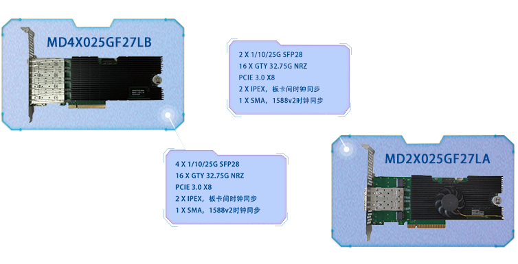 | MD2X025GF27LA | 2-7层FPGA网络模块 | 2 个 25GbE SFP28 接口支持 1/10/25G 速率模式,FPGA智能网卡精准控制速率时延 |